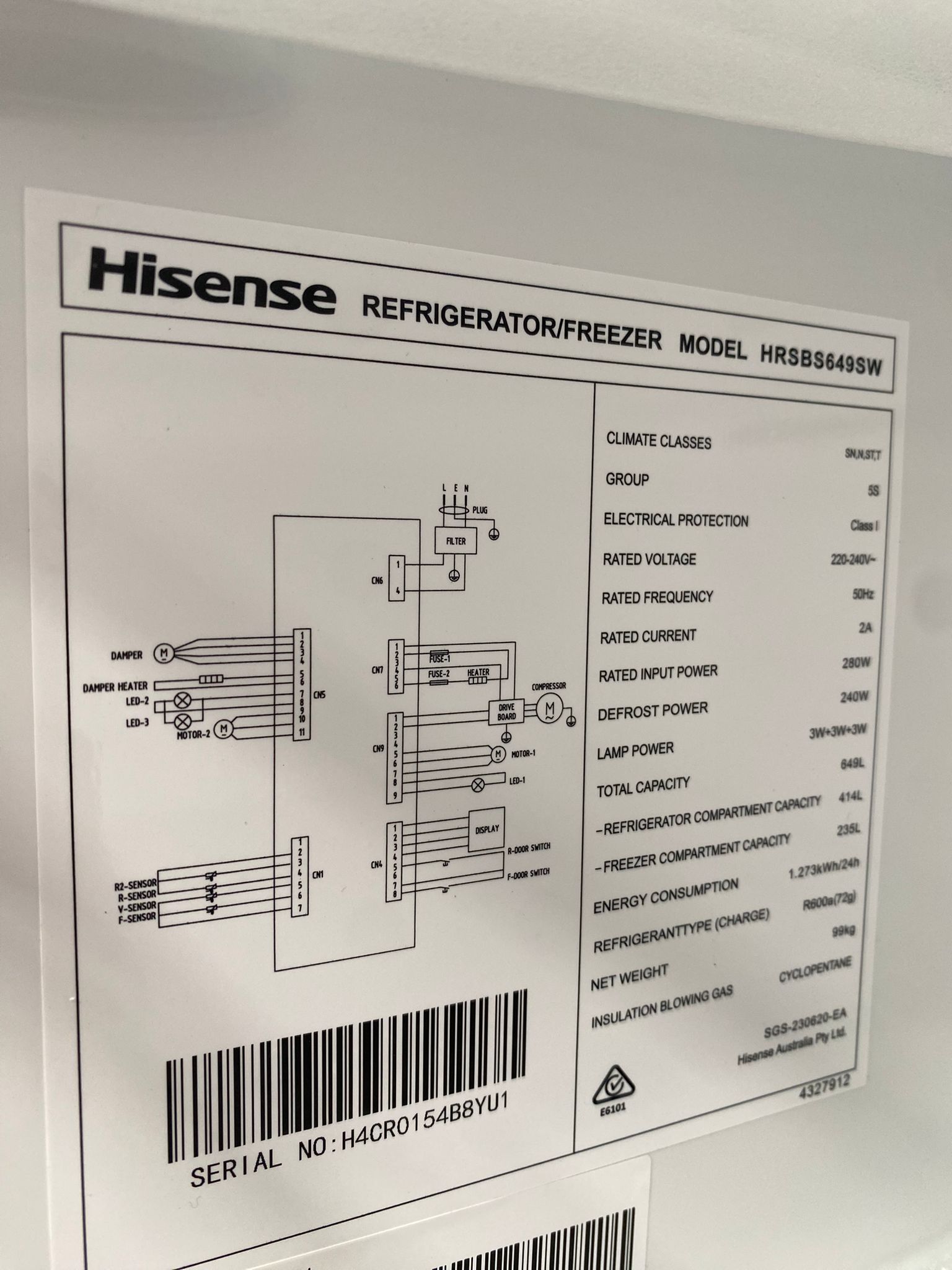 Hisense 649L Side by Side Refrigerator with Non-Plumbed Water Dispenser Factory Damage